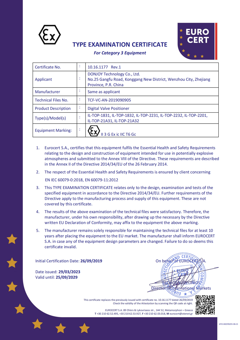 旋轉行程(角行程)閥門定位器包含 : IL-TOP-1441/IL-TOP-1891 系列,已獲得歐盟 2014/34/EU ATEX 防爆認證,證書号 ATEC.0006;...