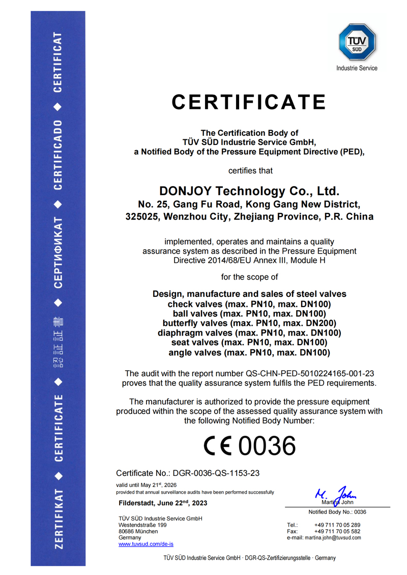閥門系列,已獲得德國 TÜV 機構實施歐盟承壓設備安全指令 PED/2014/68/EU,Annex III Module H 産品和質量體系認證;證書号:N.O.: DGR-0036-QS-1153-23;...