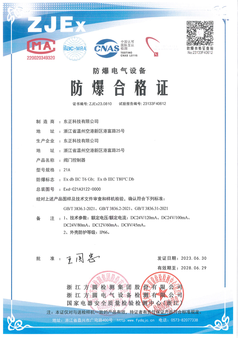 證書編号:ZJEx.23.0810 防爆等級:Ex dbⅡC T6 Gb;Ex tb IIIC T80℃ Db 适用産品:Ex-IL-TOP 21A31;Ex-IL-TOP 21A32;Ex-C-TOP 21A...